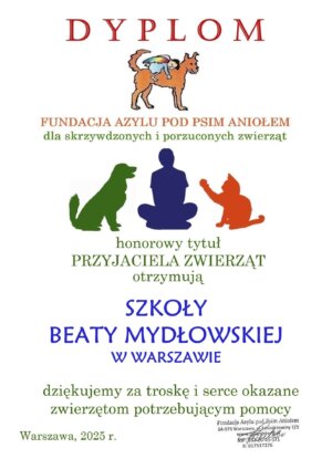 - Dyplom od Fundacji Azylu pod Psim AniołemW imieniu Fundacja Azylu pod Psim Aniołem składamy serdeczne podziękowania wszystkim, którzy wsparli naszą zbiórkę dla naszych przyjaciół mniejszych. Szczególne podziękowania kierujemy do Samorządu Szkolnego […]